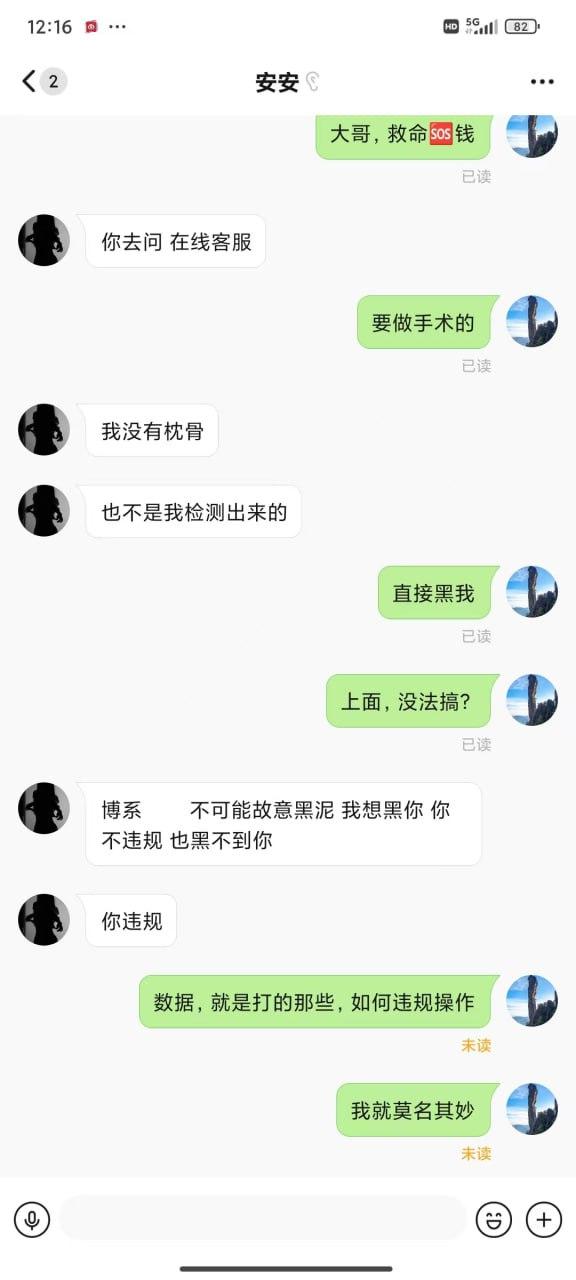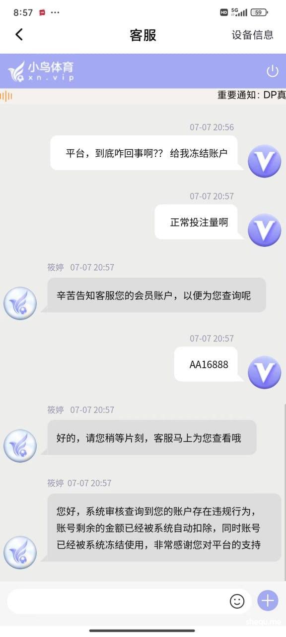 期间输输赢赢 提款都是正常的,可是就在昨天也就是7.7号充值了两千多,打了几个小时余额来到了2W,随后提款等了半小时都没有到账,期间还在投注,突然提示被迫下线,再登陆就显示账户异常。请联系客服。联系客服:就说违规投注持续关注@xinwen1看后续。至于怎么违规也说不出各所以然。玩彩票多年从来也没遇到过这样的事情。(本人玩法:喜欢追豹子,前中后豹子,任选豹子,45=23 89=23单式54注)在此希望得到曝光这样的垃圾平台,惊醒还在小鸟玩的其他玩家。这样的形式做法迟早玩完!